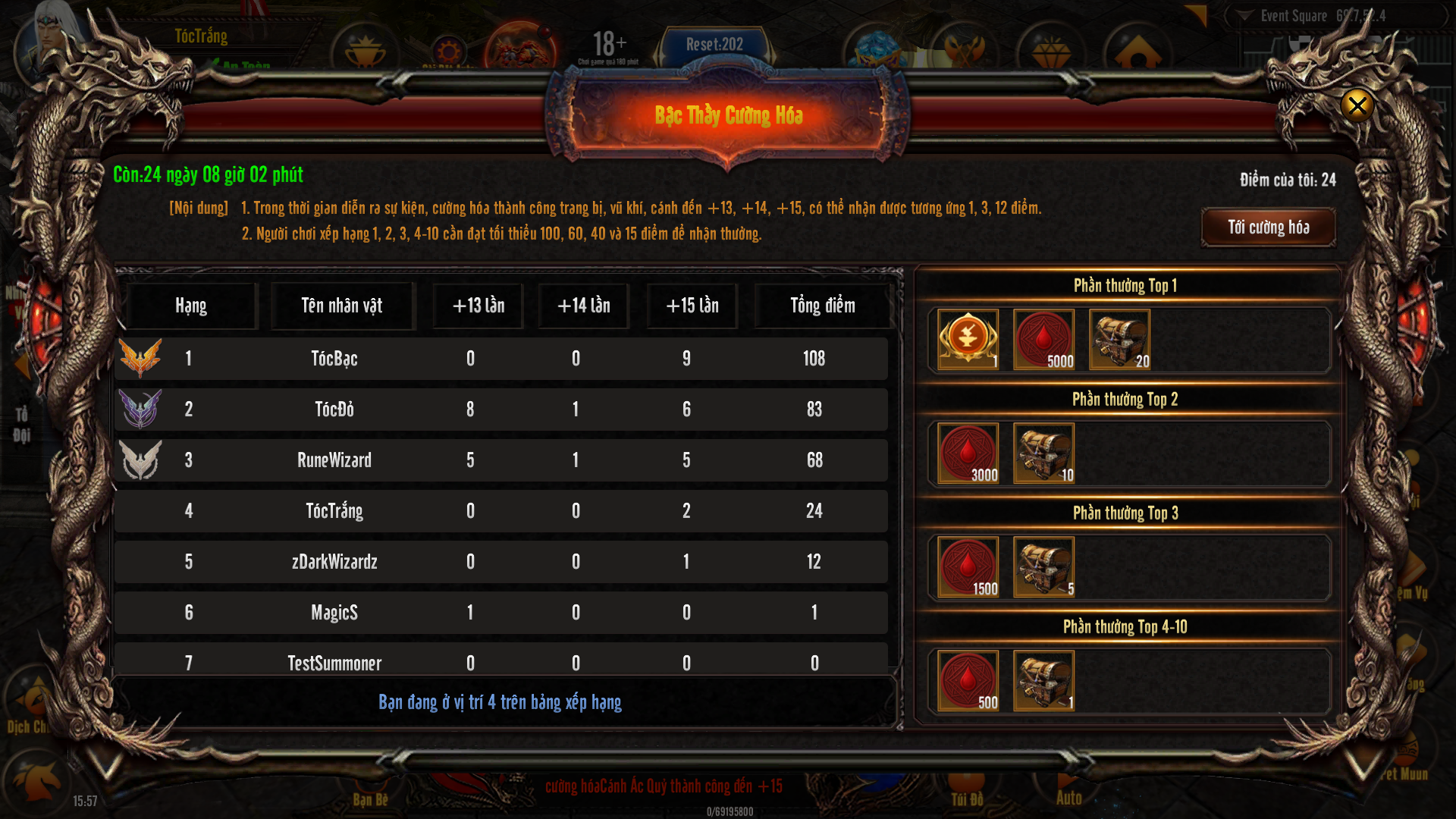 ♛ Trong thời gian diễn ra sự kiện sẽ có bảng xếp hạng đếm số lần cường hóa thành công và số điểm tổng của mỗi người chơi trong thời gian sự kiện. Bảng xếp hạng sẽ được cập nhật vào 0h00p mỗi ngày .