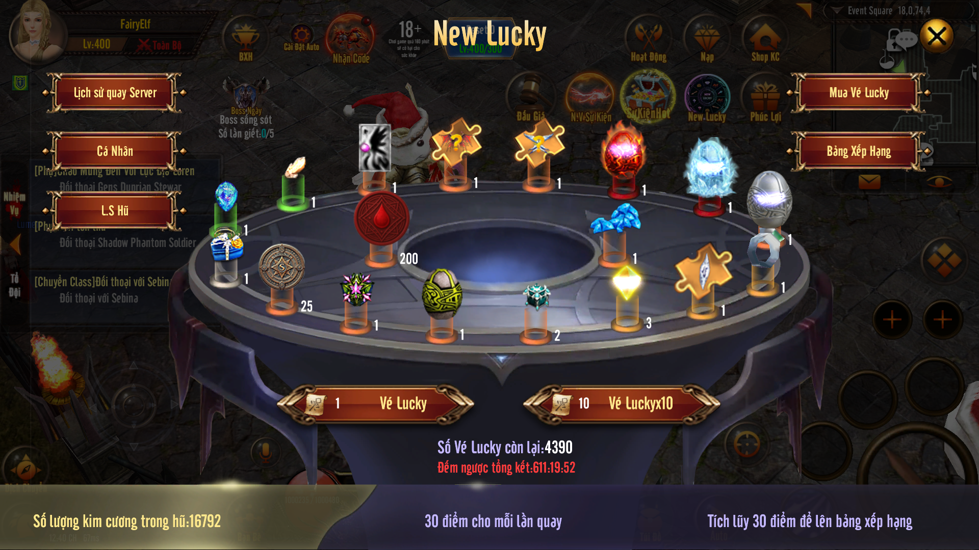Top 1: Danh hiệu Top 1 Lucky + Cánh 3 theo Class, ngẫu nhiên thuộc tính + 700 Rương Trang Bị Pet + 2000 Xu Huyết Sắc + 100 Trứng Linh Thú Bạc